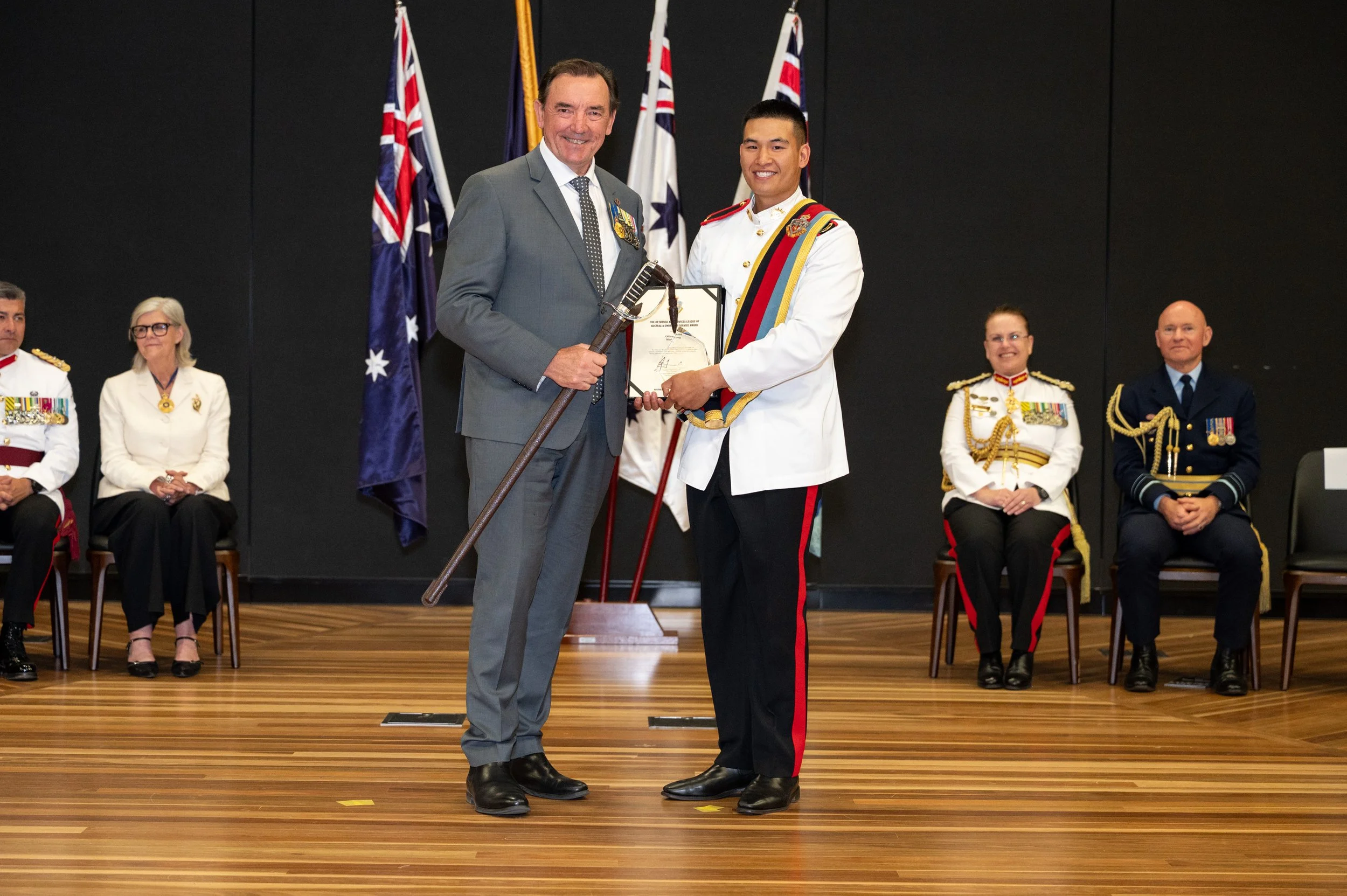 RSL National President Peter Tinley presents the RSL Sword for Service to Officer Cadet Ninh Luong ARA.