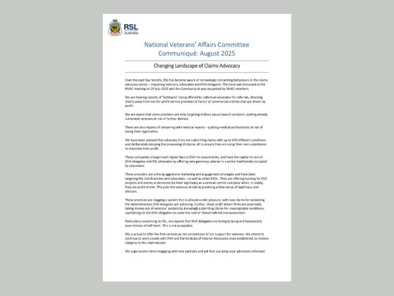 RSL has become aware of increasingly concerning behaviours in the claims advocacy sector – impacting veterans, advocates and DVA delegates. The issue was discussed at the NVAC meeting on 29 July 2025, and this Communiqué was requested by NVAC members.